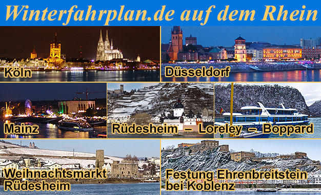 Winterfahrplan auf dem Rhein mit Winterschifffahrten der Rheinschifffahrt zwischen Düsseldorf und Mainz: ![]() Willkommen bei Winterschifffahrt.de – Ihr Tor zur winterlichen Rheinromantik !